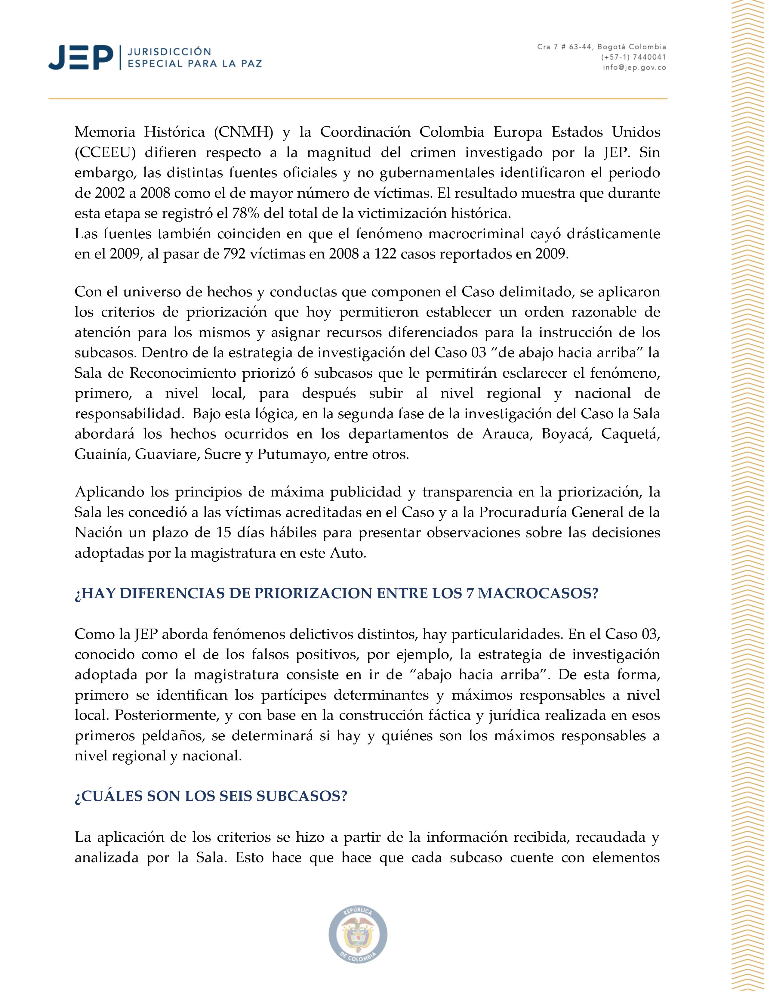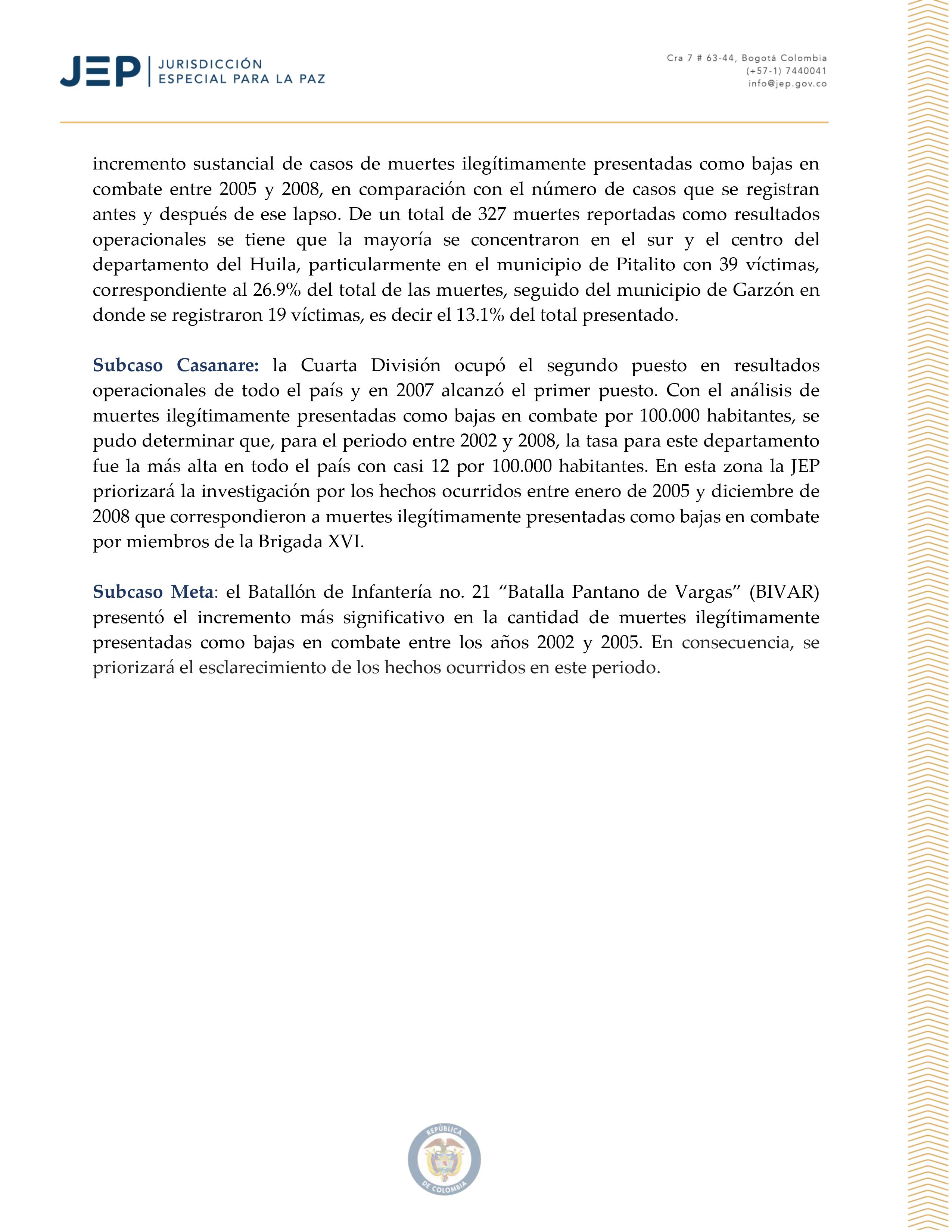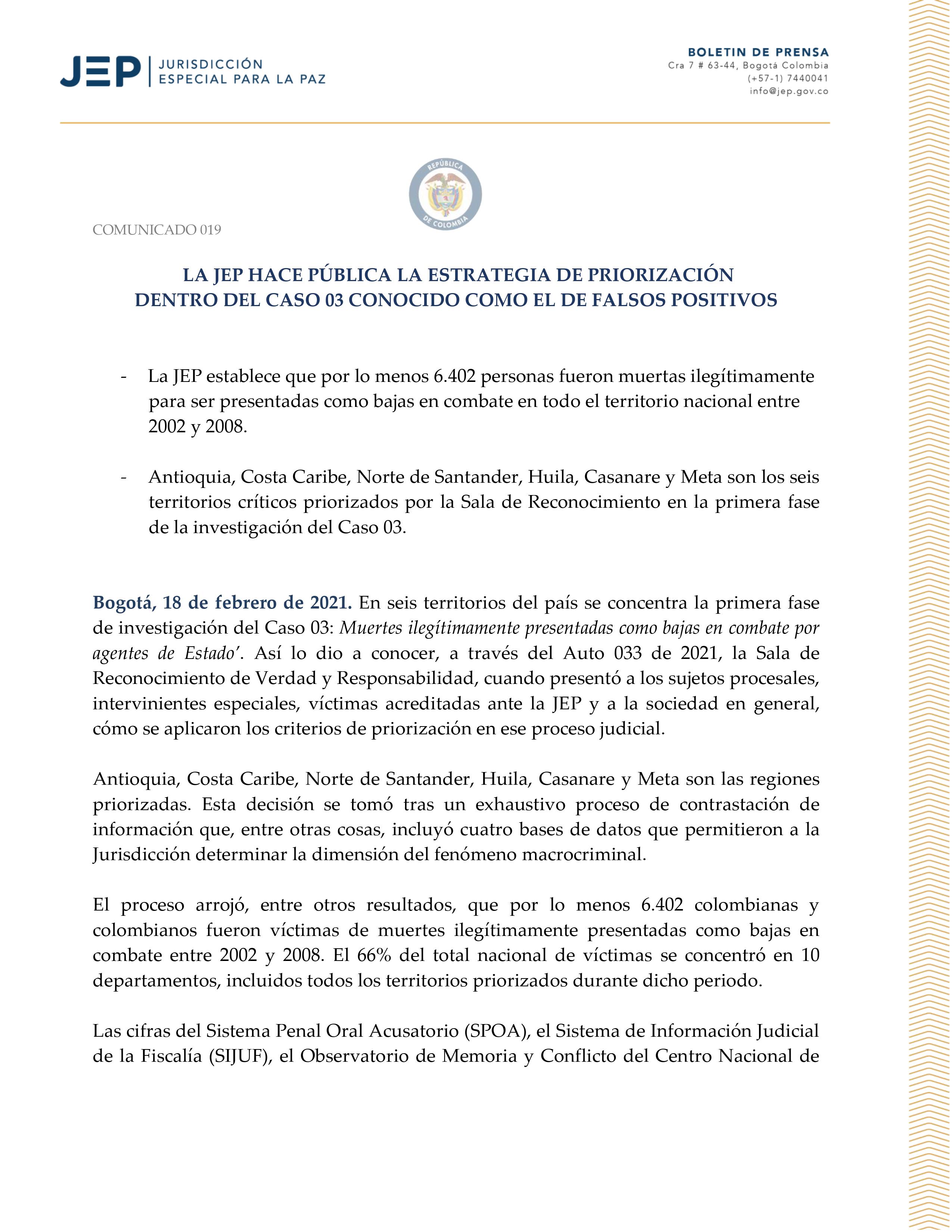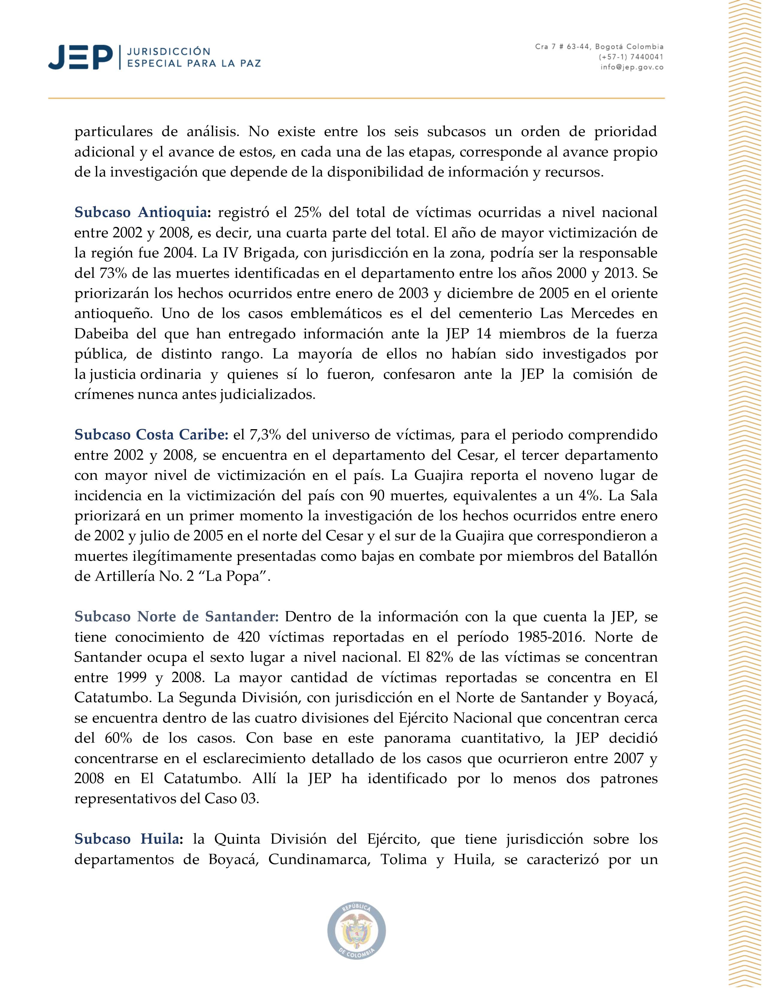 La Jurisdicciรณn Especial para la Paz en Colombia (JEP) informa: dentro del Caso #03, conocido como el de “falsos positivos” (ejecuciones extrajudiciales). Por lo menos 6.402 personas fueron muertas ilegรญtimamente para ser presentadas como bajas en combate en todo el territorio nacional entre 2002 y 2008.